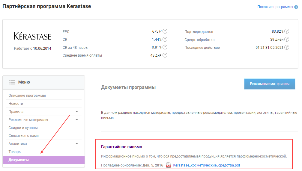 Отредактирована: 38 дней назадЕсли вам нужна лицензия или гарантийное письмо для рекламы товаров в рекламных сетях, вы можете найти их в разделе «Документы» в карточке программы. Сюда рекламодатели добавляют логотипы, лицензии, гарантийные письма, презентации и другие документы, которые могут быть полезны веб-мастерам.