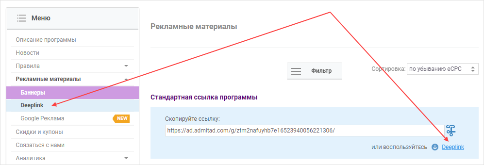 Если на странице с рекламными материалами нет раздела или кнопки «Deeplink», значит, в этой программе он не поддерживается. В этом случае скопируйте стандартную партнерскую ссылку и разместите ее на своей площадке. Как найти программы, которые поддерживают deeplink