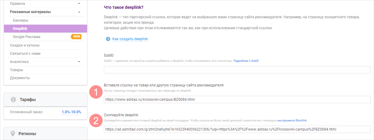 Скопируйте ссылку на страницу и вставьте ее в поле «Вставьте ссылку на товар или другую страницу сайта рекламодателя» (1). В поле «Скопируйте deeplink» (2) появится deeplink, скопируйте его и разместите на своей площадке. Как использовать партнерскую ссылку