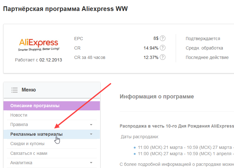 3. На странице программы в меню слева найдите вкладку «Рекламные материалы» и нажмите на нее.