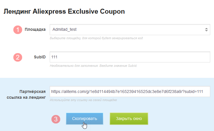 3. Выберите площадку, на которой вы планируете разместить эту ссылку. Если нужно, добавьте SubID.