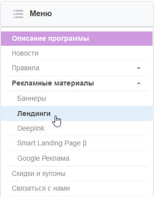 Если вкладка «Лендинги» в списке отсутствует, значит, у этой программы нет лендингов.