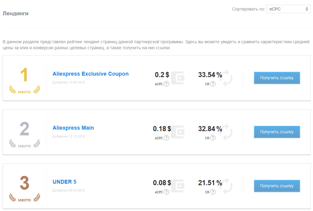 Лендинги представлены в виде списка с сортировкой по eCPC (среднему заработку с 1 клика). Также вы можете отсортировать их по CR и дате добавления.