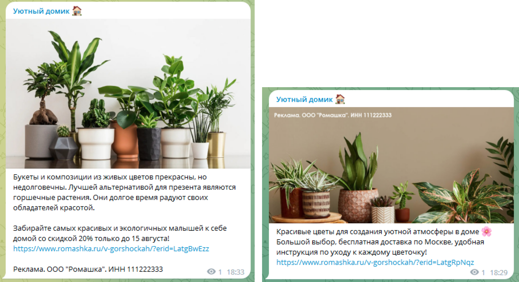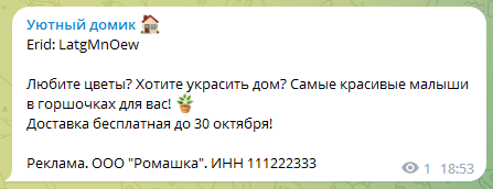Пример: Реклама. ООО “Ромашка”. ИНН 111222333