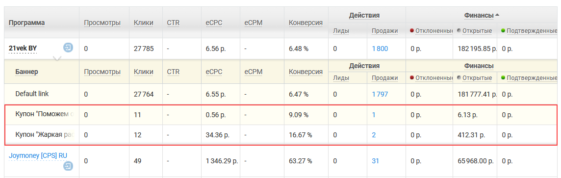 Еще один аргумент в пользу готовых купонных ссылок — это дополнительная аналитика. При использовании самодельных ссылок все клики и действия по ним будут учитываться в одной графе «Default link», а при использовании готовых ссылок вы будете видеть разбивку по отдельным купонам и сможете понять, какой купон работает, а какой не очень. Для этого перейдите в раздел «Статистика по программам» и нажмите на название программы.