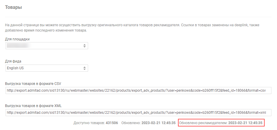 - перейти на страницу партнерской программы, открыть раздел «Товары» и в правом нижнем углу в поле «Обновлено рекламодателем» отобразится дата обновления.