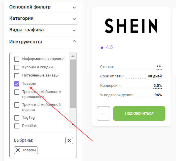 1. В каталоге Admitad Store найдите программы, в которых есть товарные фиды. Для этого в фильтре по инструментам выберите «Товары».