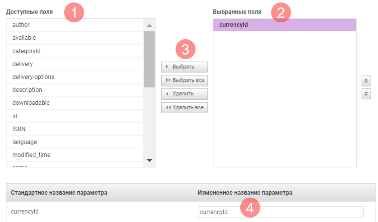 3. В блоке «Доступные поля» (1) выберите параметры, которые будут выгружаться в фид при помощи этого шаблона, и переместите их в блок «Выбранные поля» (2) используя стрелки (3).