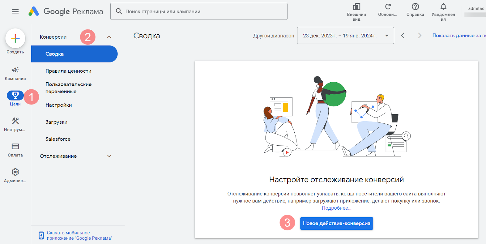 1. Нажмите на иконку «Цели», выберите «Сводка» и нажмите «Новое действие-конверсия».