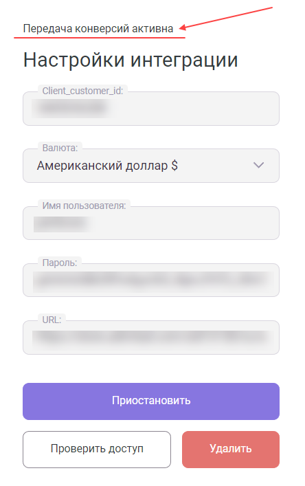 - Чтобы проверить, что интеграция работает корректно и конверсии успешно передаются, нажмите «Проверить доступ».
