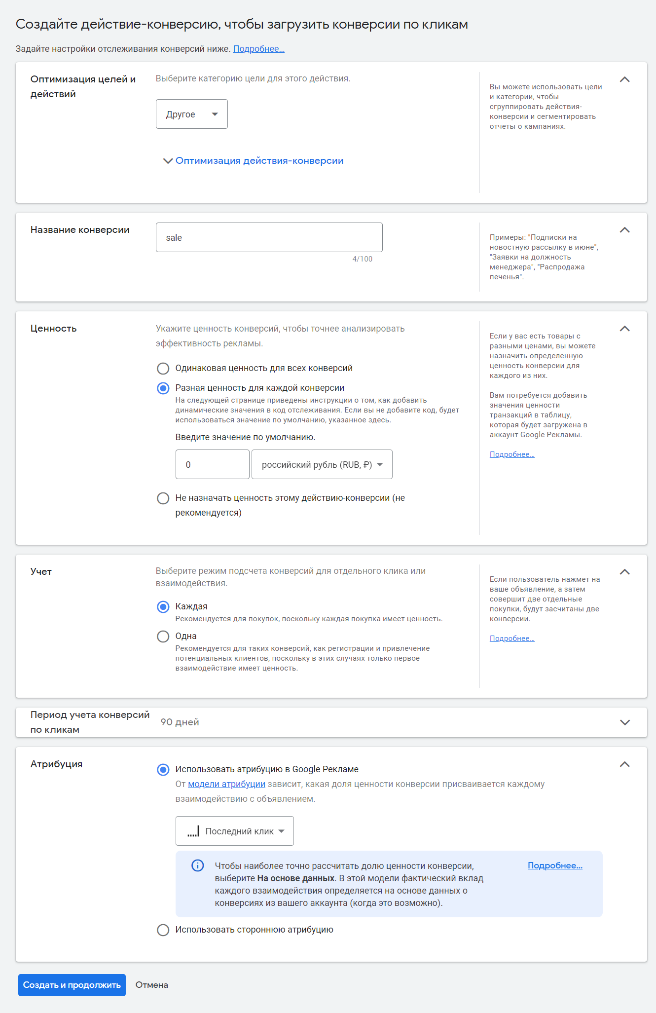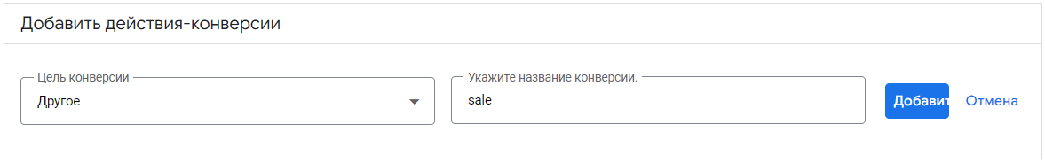 - Укажите название конверсии — введите sale (с маленькой буквы).
