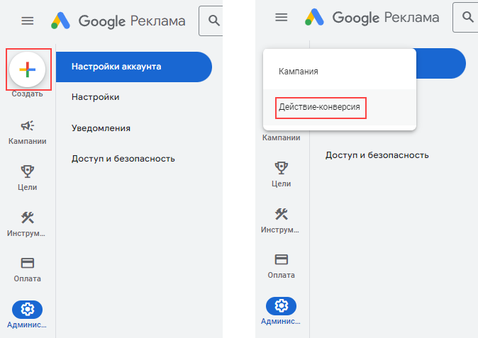 1. На панели слева нажмите «Создать» и выберите «Действие-конверсия».