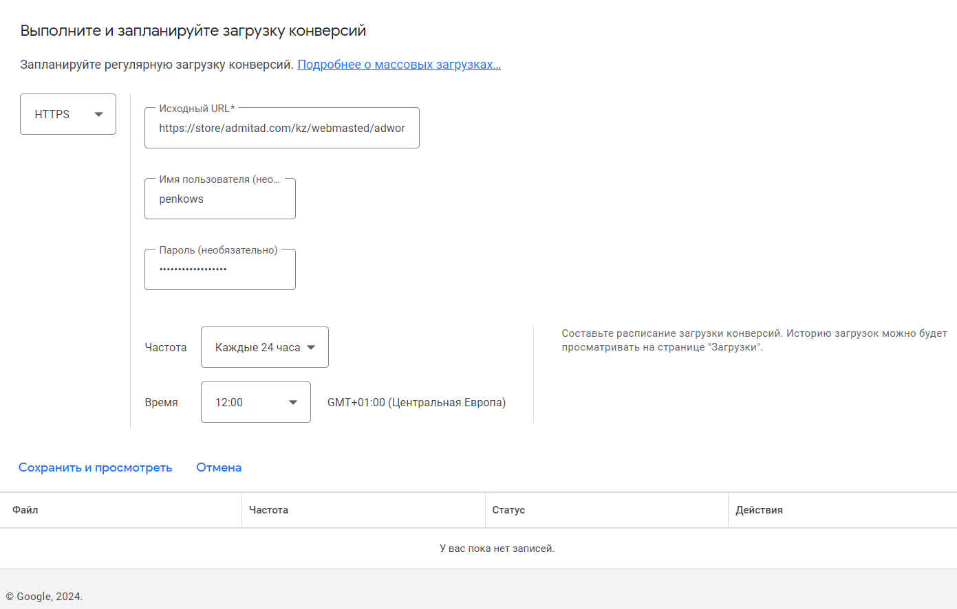 - заполните поля «Исходный URL», «Имя пользователя» и «Пароль», использовав данные из раздела «Интеграция с Google Ads» (Личный кабинет → Инструменты → Интеграция с Google Ads);
