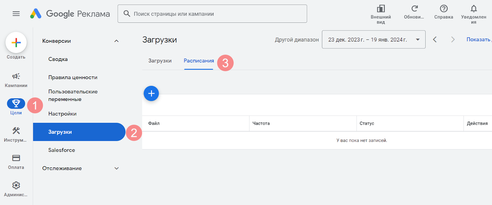 При настройке в разделе «Цели» (1) выберите «Загрузки» (2) → «Расписания» (3).