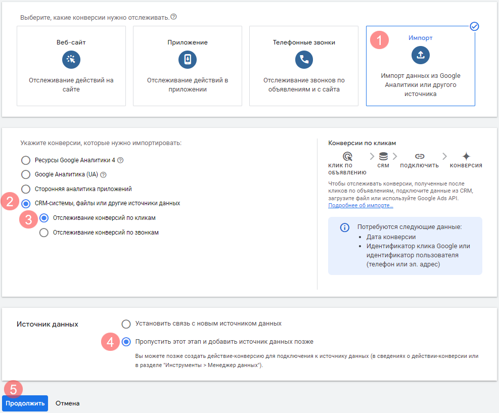 - В следующем разделе выберите «CRM-системы, файлы или другие источники данных» (2)→ «Отслеживание конверсий по кликам» (3).