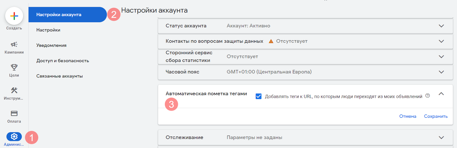 - Перейдите на вкладку «Администратор(1)» → «Настройки аккаунта» (2) и в блоке «Автоматическая пометка тегами» поставьте галочку «Добавлять теги к URL, по которым люди переходят из моих объявлений» (3).