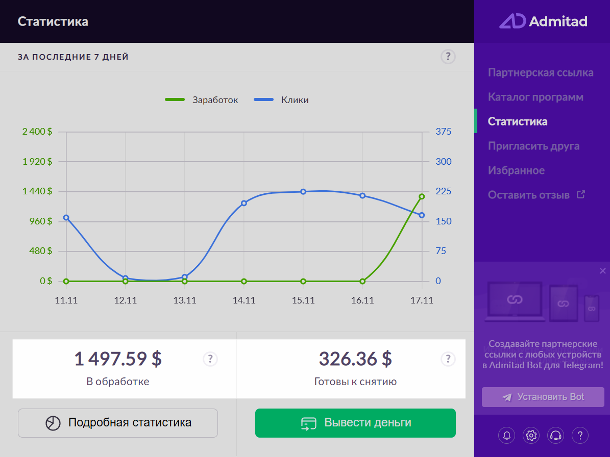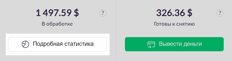 Если вы зарабатываете в нескольких валютах, наведите курсор на сумму в «Готовы к снятию». Вы увидите, сколько вы заработали в каждой валюте. Обратите внимание, что общая сумма может быть немного неточной (на сотые единицы) из-за округлений. Чтобы узнать точные суммы, перейдите на главную страницу вашего аккаунта Admitad Partner Network и посмотрите на блок «Ваш аккаунт».