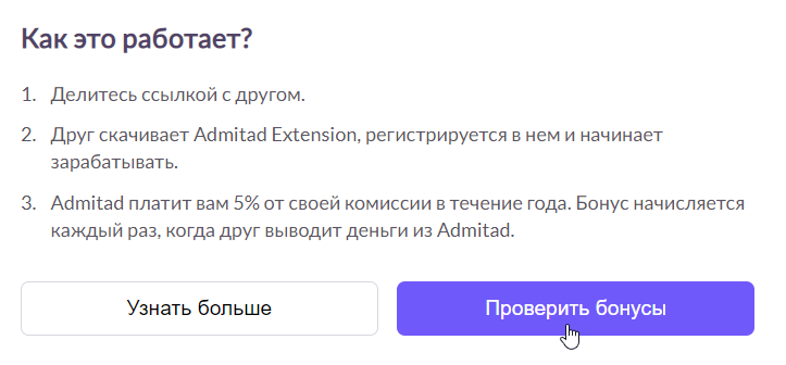 Если вы пригласили несколько друзей в расширение и хотите посмотреть, есть ли у вас уже бонусы и за кого, нажмите «Проверить бонусы».