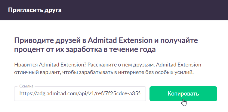 Отредактирована: 31 день назадПредположим, что вы уже делитесь ссылками из Admitad Extension с друзьями и ищете новые возможности заработать. Или напротив, вы не хотите рекламировать товары, но вам нравится сама идея дохода онлайн. В этом случае вы можете воспользоваться альтернативным способом заработка — опцией «Пригласить друга» Admitad Extension. Суть в том, что вы приглашаете других людей установить расширение и получаете за это бонусы — процент от их заработка.