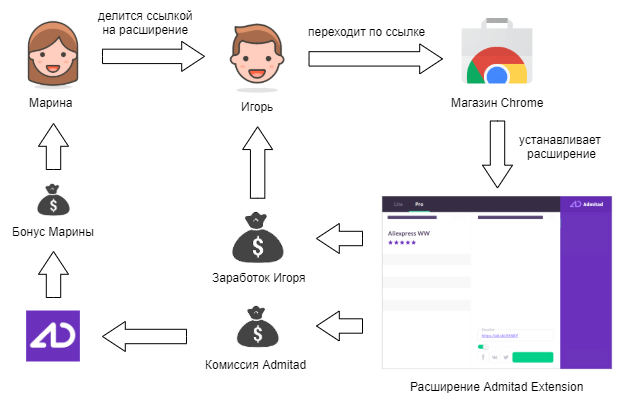 Своей радостью Марина поделилась со знакомым фуд-блогером Игорем. Выслушав историю Марины, Игорь решил, что он тоже может использовать Admitad Extension, и попросил ее скинуть ссылку на расширение. Тогда Марина вспомнила, что если пригласить друга по особой ссылке, можно получить бонус. Она нашла в расширении эту ссылку и отправила ее Игорю. Игорь установил расширение и начал постепенно добавлять ссылки под свои ролики. Его опыт тоже оказался удачным, и вскоре Игорь вывел из Admitad Partner Network первый заработок, а Марина получила от Admitad Partner Network бонус — 5% от комиссии Admitad с заработка Игоря. Теперь в течение года каждый раз, когда Игорь будет выводить деньги, Марине будут приходить бонусы.