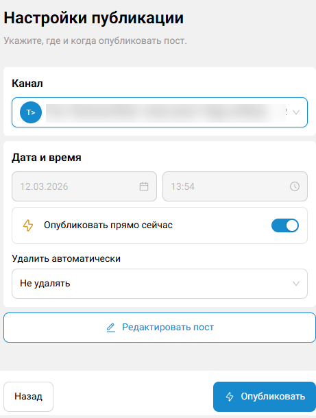 8.1. В поле «Канал» выберите канал для публикации.