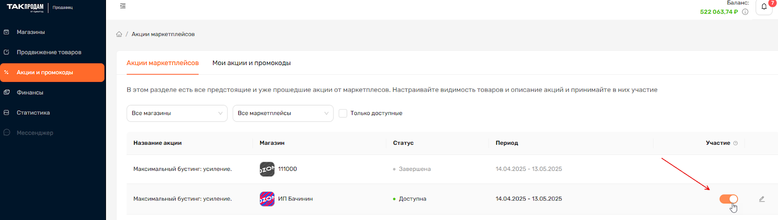 7. На странице «Мои акции и промокоды» включите акцию, используя переключатель в колонке «Активность».