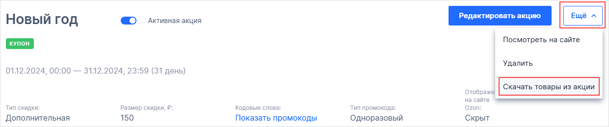 4. Нажмите «Еще» и выберите «Скачать товары из акции».