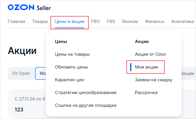 1. Перейдите в раздел «Цены и акции» → «Акции» → «Мои акции».