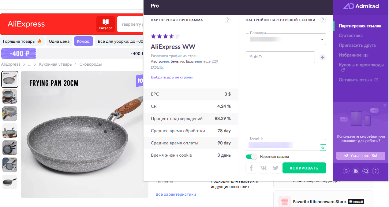 С помощью Admitad Extension можно создать deeplink только с компьютера или ноутбука, т.к. создание с мобильных устройств не поддерживается.