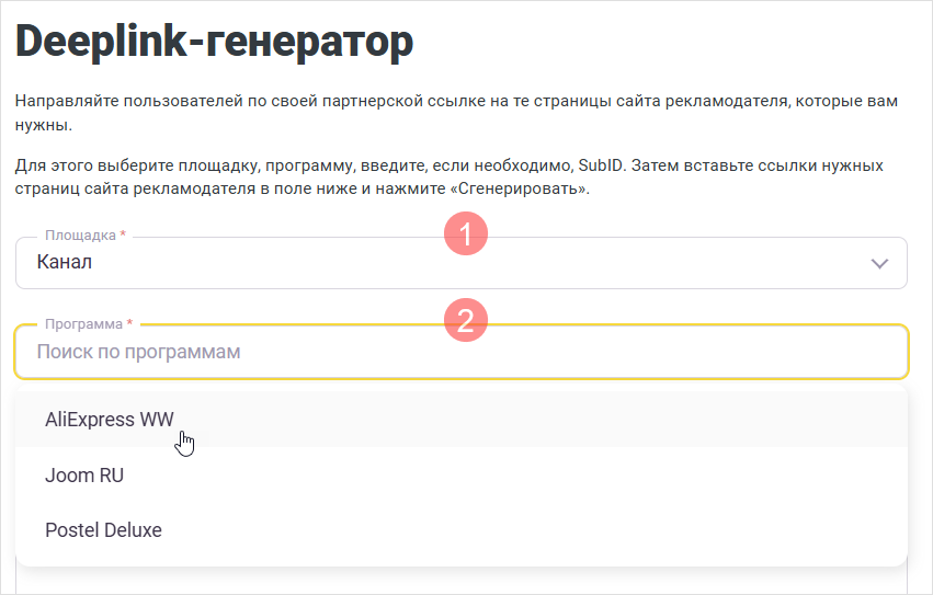 7. В поле «Скопируйте deeplink» (2) появится deeplink. Скопируйте его и разместите на своей площадке. Как использовать партнерскую ссылку