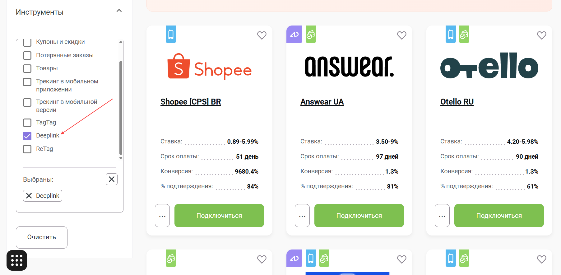 2. В фильтре «Инструменты» отметьте галочкой опцию «Deeplink». Вы увидите программы, в которых поддерживается deeplink.