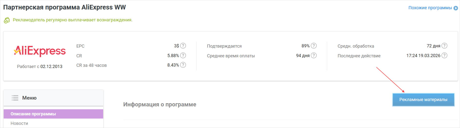 4. На странице партнерской программы нажмите «Рекламные материалы».