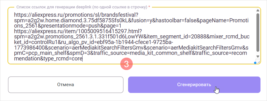 Скопируйте ссылку на страницу и вставьте ее в поле «Список ссылок для генерации deeplink» (3).