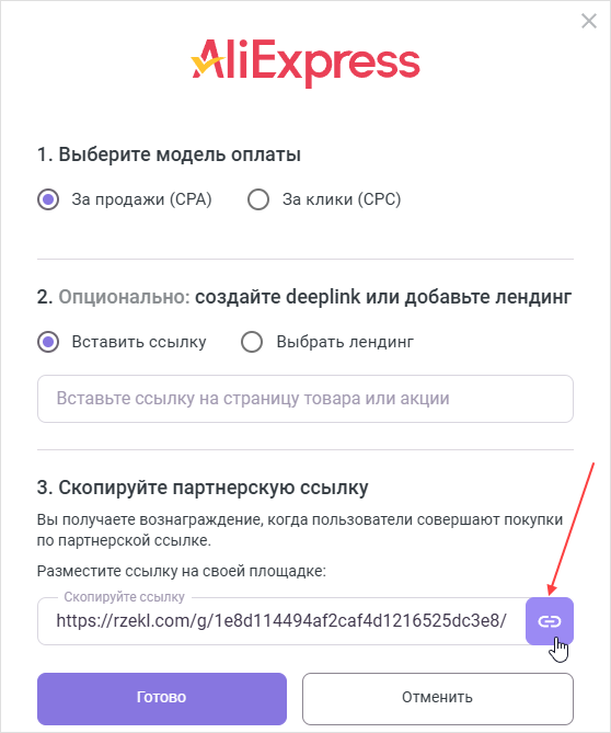 Если во всплывающем окне нет поля «Вставьте ссылку на страницу товара или акции», значит, в этой программе нельзя использовать deeplink. В этом случае скопируйте стандартную партнерскую ссылку и разместите ее на своей площадке. Как найти программы, которые поддерживают deeplink